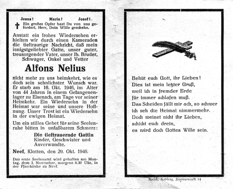 | Gefallener 2. Weltkrieg; 44 J.; vergeiratet, Kinder; Wohnort Neef |