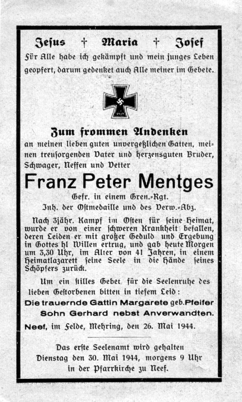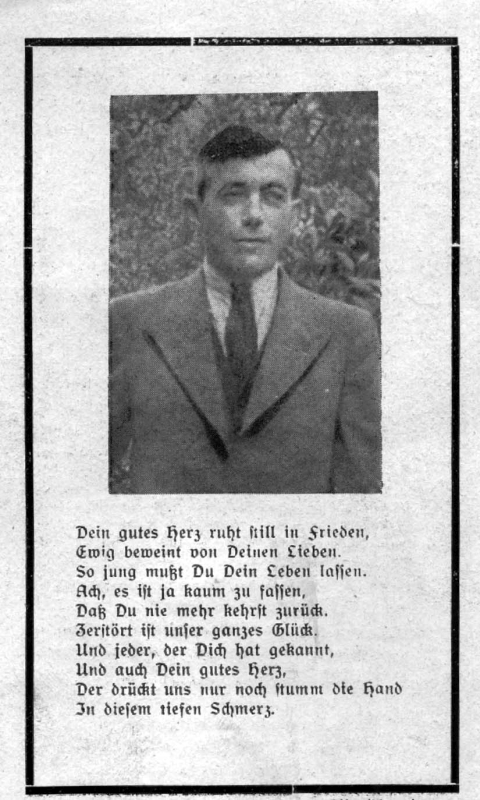 Gefallener 2. Weltkrieg; nach 3 J. im Osten von schwerer Krankheit befallen; 41 J.; ∞ Margarete Pfeifer; Sohn Gerhard; Wohnort Neef |