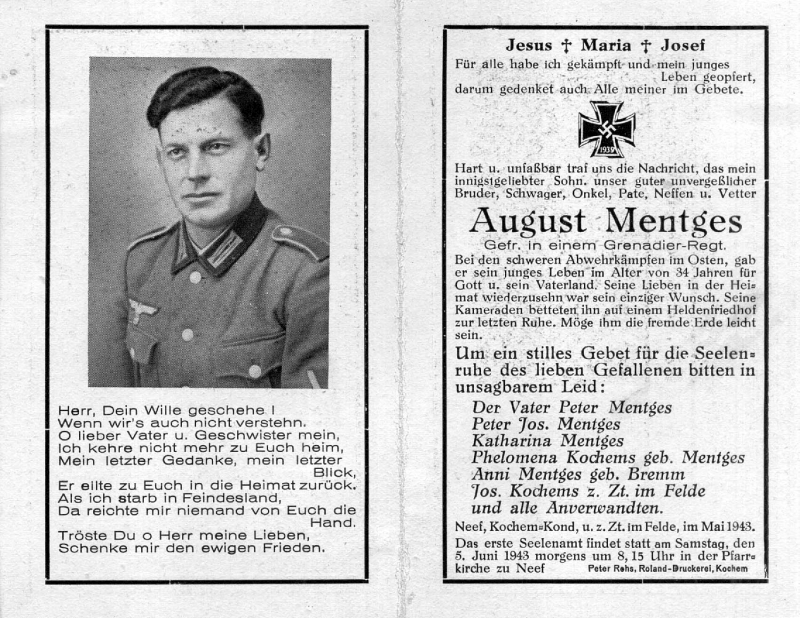 Gefallener 2. Weltkrieg; 34 J.; Vater: Peter Mentges; Wohnort: Neef |