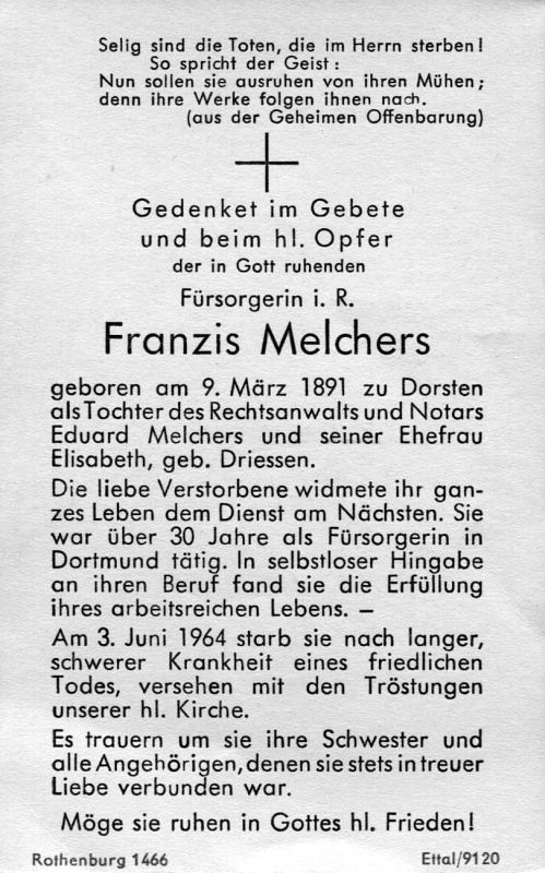 Eltern: Rechtsanwalt u. Notar Eduard Melchers u. Elisabeth geb. Driessen; über 30 J. als Fürsorgerin in Dortmund tätig; im Ruhestand; lange, schwere Krankheit |