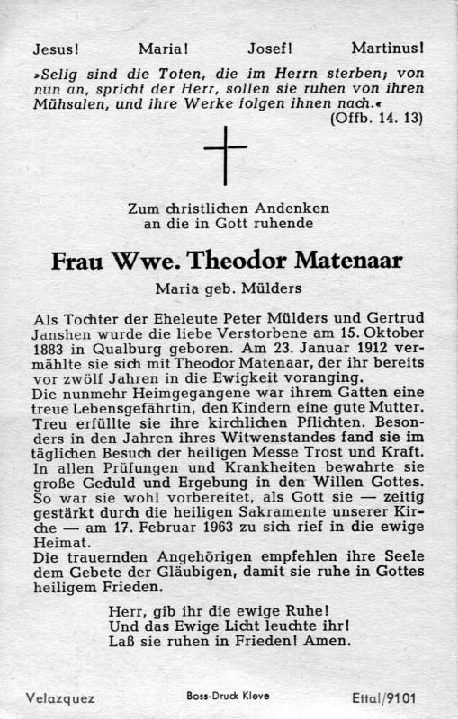 Eltern: Peter Mülders u. Gertrud geb. Janshen (Janhsen?); ∞ 23.1.1912 Theodor Matenaar, † vor 12 J.; Kinder |