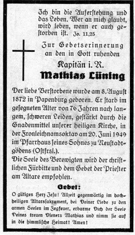 Kapitän; er starb im Pfarrhaus seines Sohnes in Neustadtgödens |