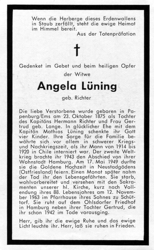 Eltern: Kapitän Hermann Richter u. Gertrud geb. Lange; ∞ Kapitän Mathias Lüning; 4 K.; Ehemann 1914-20 in Chile interniert; 1943 Abschied von ihrer Wohnstadt Hamburg; 17.5.1949 Goldene Hochzeit in Neustadtgödens, Ostfriesland; Ehemann † 1 Monat später; sie starb im Pfarrhaus ihres Sohnes in Schüttorf; beerdigt in Hamburg, Ohlsdorfer Friedhof, neben der 1942w verstorbenen Tochter Gertrud |