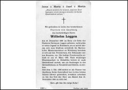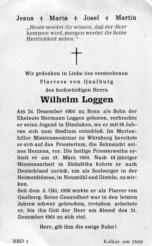 Vater: Hermann Loggen; Jugend in Dinslaken; Besuch des Marianhiller Missionsseminars in Würzburg; Priesterweihe 17.3.1934; 18 J. Missionsarbeit in Südafrika; danach Rückkehr nach Deutschland; Seelsorger in Neumühl u. Disteln; 3.10.1956 Pfarrer von Qualburg |
