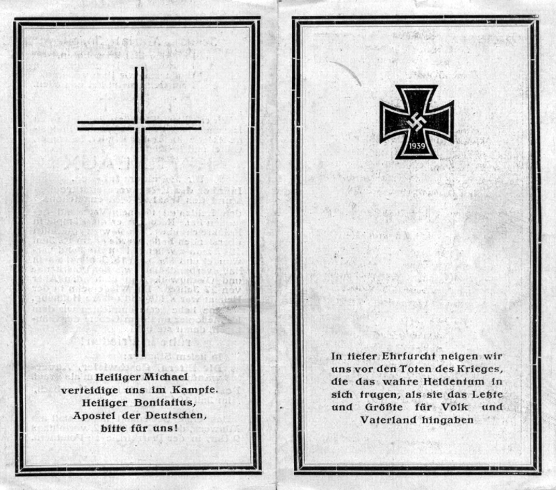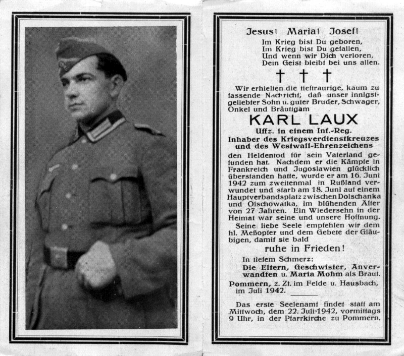 Gefallener 2. Weltkrieg; 27 J.; verlobt mit Maria Mohm; Wohnort: Pommern |