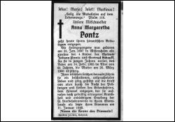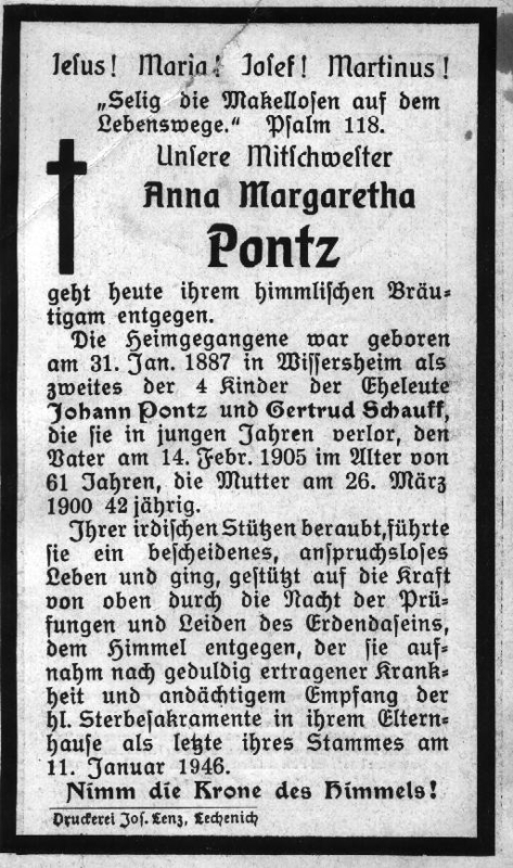 Eltern: Johann Pontz, † 14.2.1905, u. Gertrud Schauff, † 26.3.1900; Druck in Lechenich |