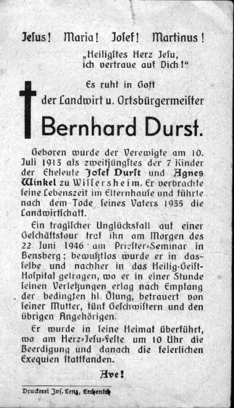 Landwirt u. Ortsbürgermeister; auf einer Geschäftstour traf ihn in Bensberg ein tragischer Unglücksfall; Eltern: Josef Durst u. Agnes Winkel; führte in Wissersheim die Landwirtschaft seines 1935 verstorbenen Vaters weiter; Druck in Lechenich |