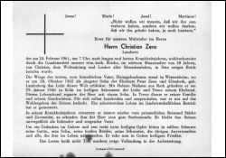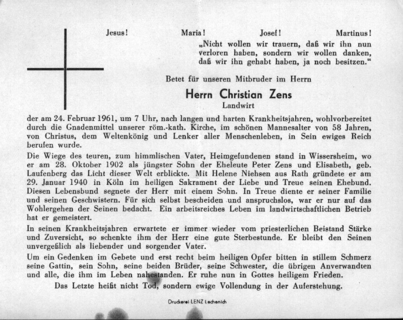 Landwirt; lange Krankheit; Eltern: Peter Zens u. Elisabeth geb. Laufenberg; ∞ 29.1.1940 in Köln Helene Niehsen aus Rath; 1 Sohn; Druck in Lechenich |