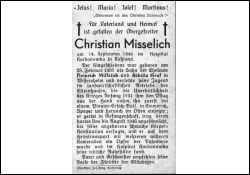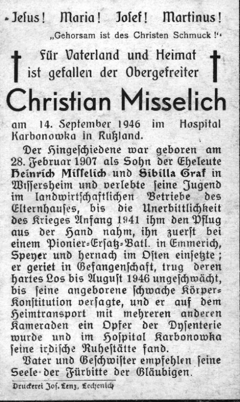 Gefallener 2. Weltkrieg; Eltern: Heinrich Misselich u. Sibilla geb. Graf; arbeitete im landw. Betrieb der Eltern; Anfang 1941 Einberufung; Einsatz im Osten; Gefangenschaft; Dysenterie; Druck in Lechenich |