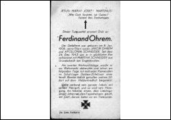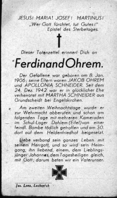 Gefallener 2. Weltkrieg; Eltern: Jakob Ohrem u. Apollonia geb. Schneider; ∞ 24.12.1942 Martha Schneider aus Grundscheidt b. Engelskirchen; 26.12.1944 abberufen zur Wehrmacht; bereits am nächsten Tag mit mehreren Kameraden im Schul-Lager Dahlem tödlich getroffen; Druck in Lechenich |
