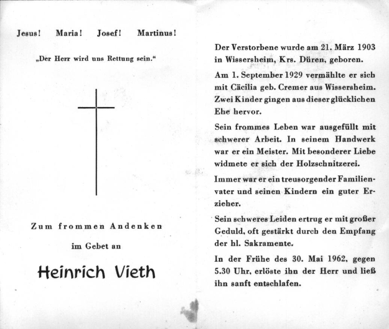 ∞ 1.9.1929 Cäcilia Cremer aus Wissersheim; 2 K.; Handwerker; widmete sich der Holzschnitzerei |