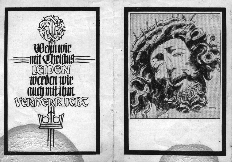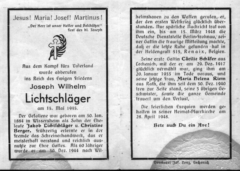 Gefallener 2. Weltkrieg; Soldat im 1. Weltkrieg; als 60-Jähriger am 30.5.1944 zu den Waffen gerufen; letzte ruhe in der Heldengruft 515, Renaix, Belgien; Todesnachricht kam erst am 15.3.1948; ∞ 29.12.1917 Cäcilie Schäfer aus Lechenich, † 20.1.1933; ∞ 30.12.1940 Maria Helene Riem aus Rath; Druck in Lechenich |