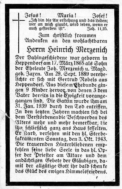 Eltern: Johann Merzenich u. Magdalena geb. Jaxen; OO 29.9.1889 Gertrud Robels aus Heppendorf, † 31.1.1939; 9 K., davon 3 †; Beschwerden des Alters fesselten ihn zuletzt an das Haus |