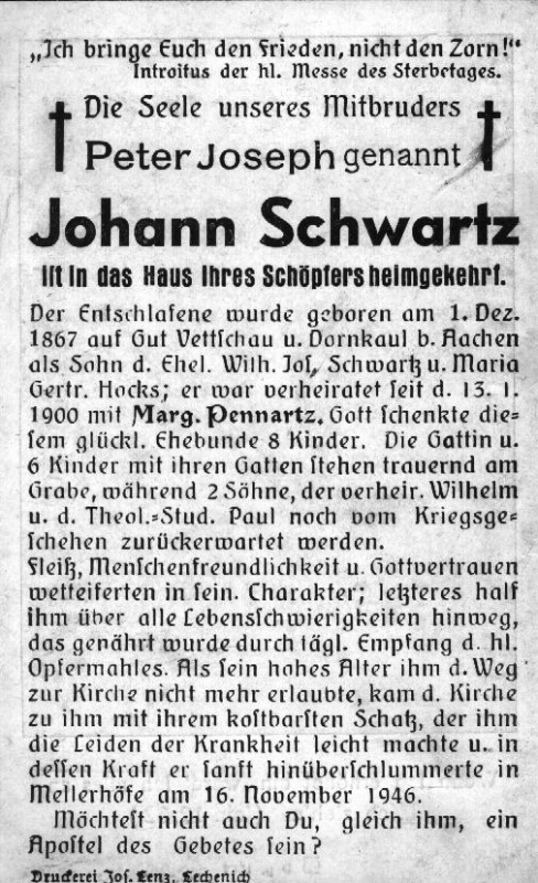 Eltern: Wilhelm Josef Schwartz u. Maria Gertrud Hocks; ∞ 13.1.1900 Margarete Pennartz; 8 K., 2 Söhne (Wilhelm, Paul) noch in Kriegsgefangenschaft; Druck in Lechenich |