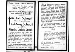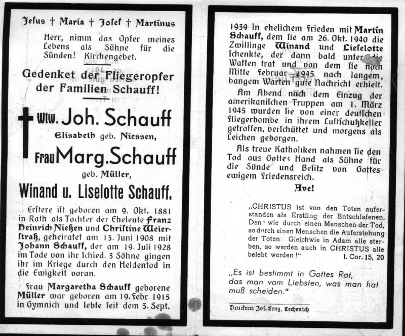 Opfer 2. Weltkrieg; am Abend nach dem Einmarsch der amerikan. Truppen wurde sie im Luftschutzkellen von einer deutschen Fliegerbombe verschüttet; Zwillingskind; Eltern: Martin Schauf u. Margaretha geb. Müller; Druck in Lechenich |