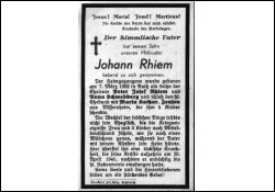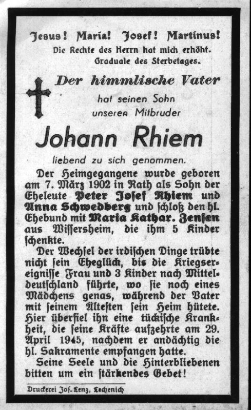 Eltern: Peter Josef Rhiem u. Anna geb. Schwedberg; ∞ Maria Katharina Zensen aus Wissersheim; 5 K.; Frau 1944/45 wegen der Kriegsereignisse mit 3 Kindern nach Mitteldeutschland evakuiert; er selbst blieb mit ältestem Sohn zurück; dabei erlag er einer heimtückischen Krankheit; Druck in Lechenich |