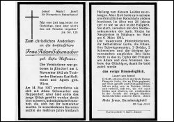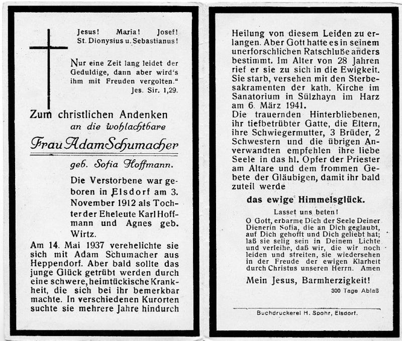 28 J.; Eltern: Karl Hoffmann u. Agnes geb. Wirtz; OO 14.5.1937 Adam Schumacher aus Heppendorf; bald machte sich heimtückische Krankheit bemerkbar; besuchte verschiedene Kurorte (Heppendorf) |