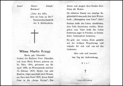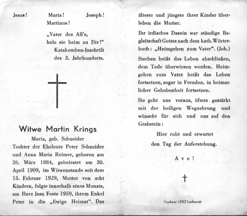 Eltern: Peter Schneider u. Anna Maria geb. Reimer; ∞ 30.4.1909 Martin Krings, † 15.2.1929; 8 K., davon 6 †; Druck in Lechenich |