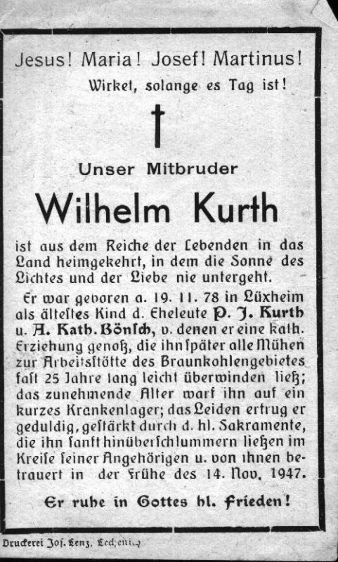 Eltern: P. J. Kurth u. A. Kath. geb. Bönsch; fast 25 J. im Braunkohlengebiet beschäftigt; Druck in Lechenich |