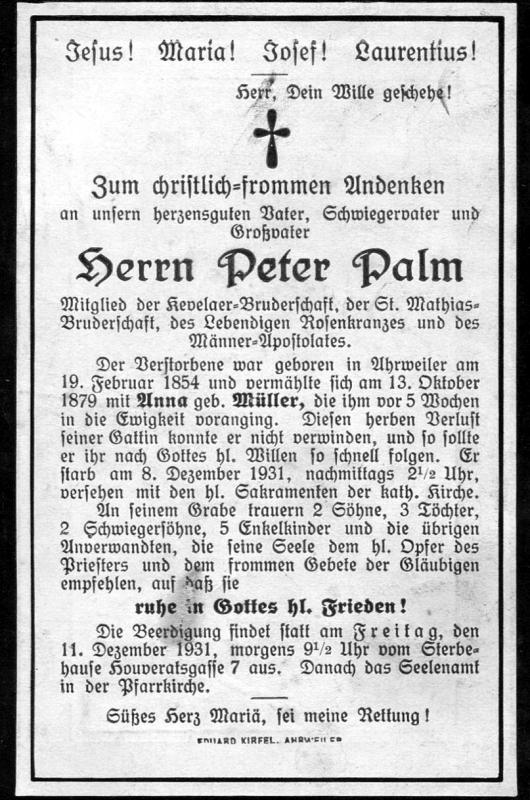 Mitgl. Kevelaer-Bruderschaft, St.-Matthias-Bruderschaft, Lebendiger Rosenkranz u. Männerapostolat; ∞ 13.10.1879 Anna Müller, † vor 5 Wochen; 5 überlebende Kinder; Druck in Ahrweiler |
