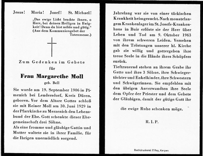 OO 30.6.1929 Reiner Moll in Pfarrkirche zu Merzenich; jahrelang von tückischer Krankheit heimgesucht; 3 überlebende Söhne |