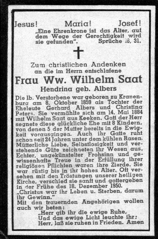 Eltern: Gerhard Albers u. Christina geb. Peters; ∞ 14.5.1884 Wilhelm Saat aus Keeken, † vor 24 J.; 8 K., davon 5 †; |