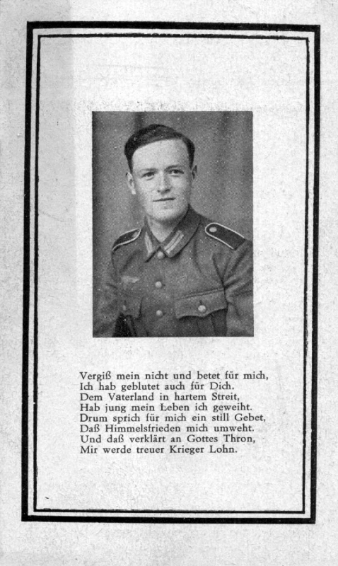 | Gefallener 2. Weltkrieg; 21 J.; bei schweren Kämpfen im Osten verwundet; Eltern: Ehel. Johann Scheid; Wohnort: Neef; Druck in Cochem a.d.Mosel |