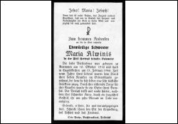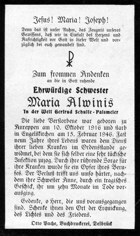 | Fast 9 J. diente sie als Ordensschwester de Kranken; sie wurde ein Opfer ihres Berufes; ihre Schwester Änne † vor 10 Mon. Durch ein tragisches Geschick; Druck in Delbrück |