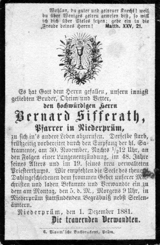 | 48 J.; 19. J. seines PriestertumsM Pfarrer in Niederprüm; Lungenentzündung; Druck in Prüm |