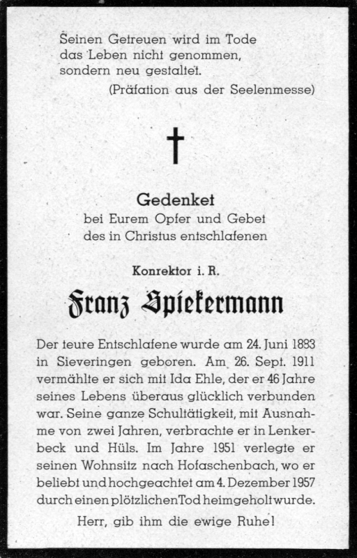 | Konrektor i. R.; ∞ 26.9.1911 Ida Ehle; 46 J. Ehe; langjähriger Lehrer in Lenkerbeck u. Hüls; 1951 Umzug nach Hofaschenbach |
