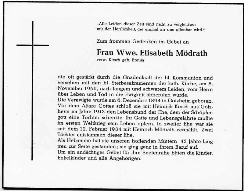 OO 1913 Heinrich Kirsch aus Golzheim, gefallen im 1. Weltkrieg; 1 Tochter; OO 12.2.1934 Heinrich Mödrath; 2 Töchter; 43 J. als Hebamme tätig |