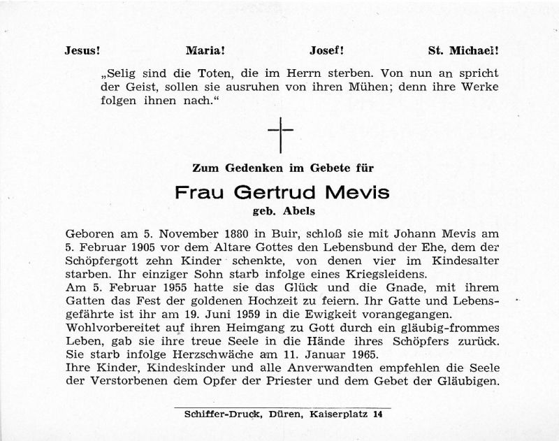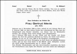 OO 5.2.1905 Johann Mevis, † 19.6.1959; 10 K., davon 4 früh †; einziger Sohn an Kriegsleiden (1. Weltkrieg) † |