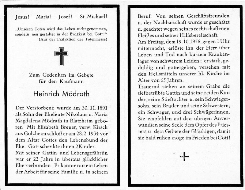 Eltern: Nikolaus u. Maria Magdalena Mödrath; OO 28.2.1934 Elisabeth Breuer, verw. Kirsch aus Golzheim; 2 K. (Buir) |