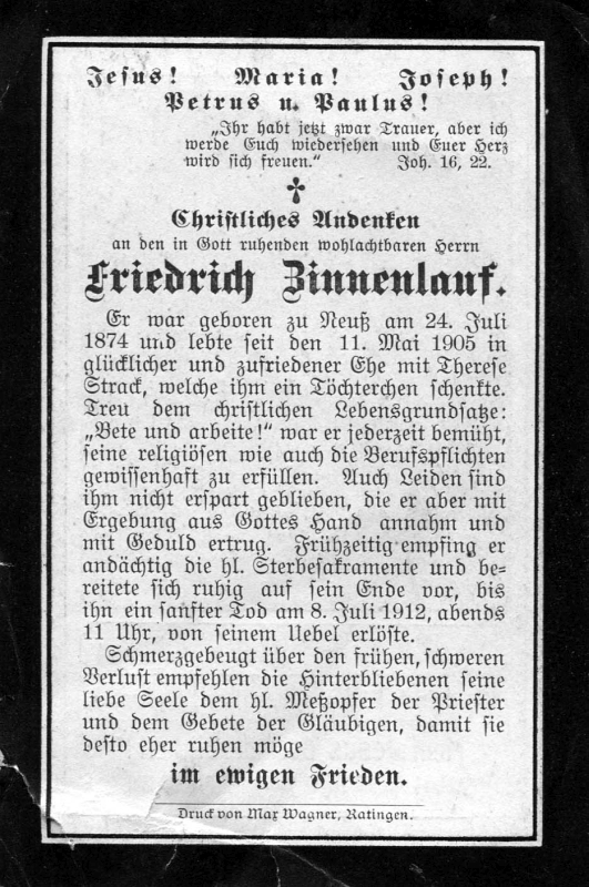 ∞ 11.5.1905 Therese Strack; 1 Tochter; Druck in Ratingen |