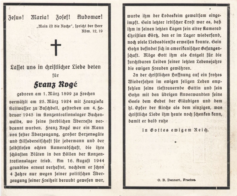 Verfolgter des Naziregimes; ∞ 25.3.1924 Franziska Kaltwasser aus Buschbell; 4 J. wegen seiner politischen Überzeugung inhaftiert; er durchlitt die Höllen der Konzentrationslager; am 16.8.1944 grundlos erneut verhaftet (vermutlich "Aktion Gewitter"); in seinen letzten Tagen traf er im Lager seinen alten Kameraden Christian Görtz; sein Sohn in amerikanischer Kriegsgefangenschaft |