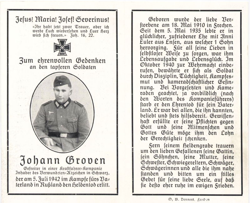 Gefallener 2. Weltkrieg; ∞ 5.5.1935 Anni Euler aus Ensen; 1 Sohn; Okt. 1940 Einberufung |