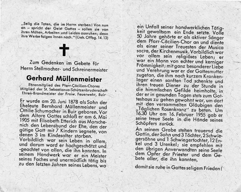 Stellmacher- u. Schreinermeister; Eltern: Bernhard Müllenmeister u. Ottilie Schumacher; ∞ 6.5.1905 Elisabeth Etterich aus Morschenich; 7 K., davon 3 früh †; 50 J. Pfarr-Cäcilien-Chor; Ehrenbrandmstr. in Buir |