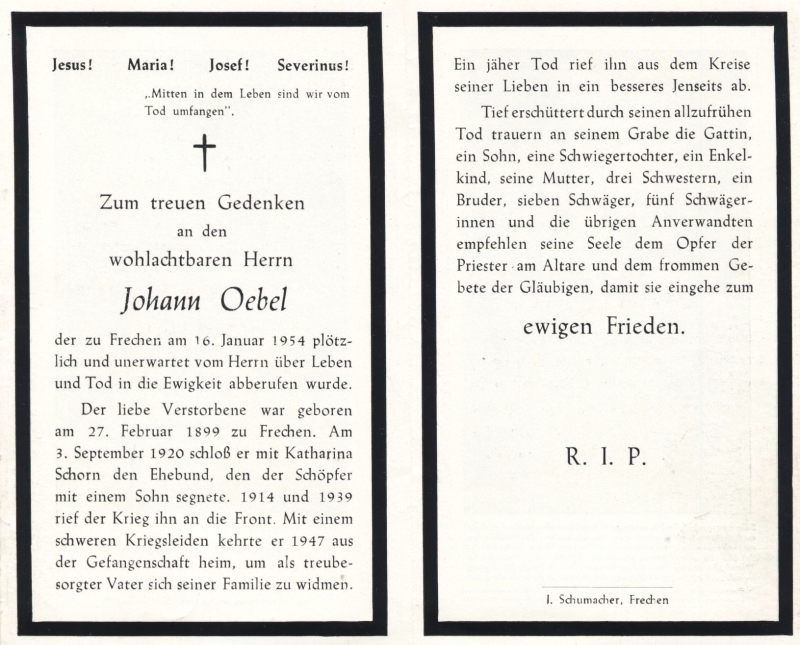 Opfer 2. Weltkrieg; ∞ 3.9.1920 Katharina Schorn; 1 Sohn; Soldat im 1. u. 2. Weltkrieg; kehrte mit schwerem Kriegsleiden 1947 aus der Kriegsgefangenschaft |