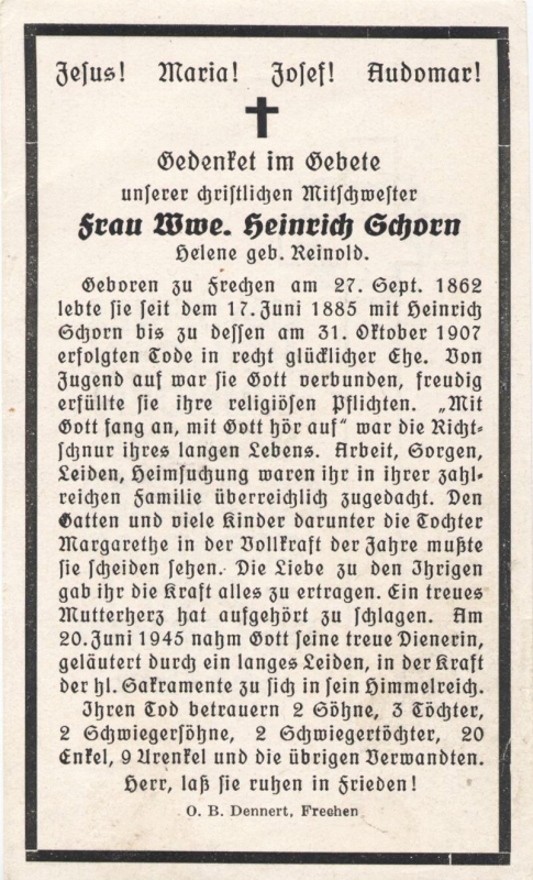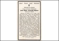 ∞ 17.6.1885 Heinrich Schorn, † 31.10.1907; viele Kinder, davon Tochter Margarethe †; 5 überlebende K. |