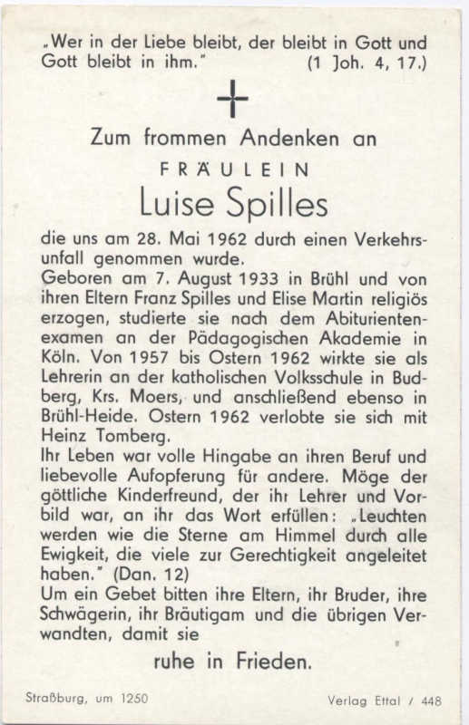 Tod durch Verkehrsunfall; Eltern: Franz Spilles u. Elise geb. Martin; Pädag. Akademie Köln; 1957-62 Lehrerin in Budberg, Kr. Moers; anschließend Lehrerin in Brühl-Heide; Ostern 1962 Verlobung mit Heinz Tomberg; |