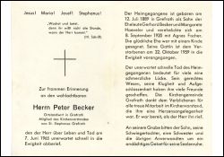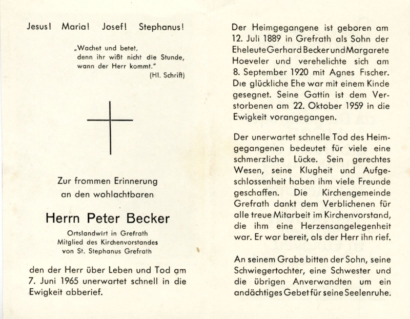 | Ortslandwirt in Grefrath; Mitgl. Kirchenvorstand; Eltern: Gerhard Becker u. Margarete geb. Hoeveler; ∞ 8.9.1920 Agnes Fischer, † 22.10.1959; 1 K. |