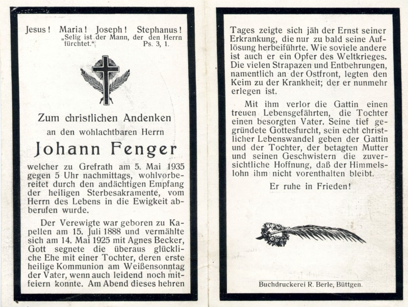 | ∞ 14.5.1925 Agnes Becker; 1 Tochter; Opfer 1. Weltkrieg: er starb an den gesundheitlichen Schäden aus dem 1. Weltkrieg |