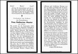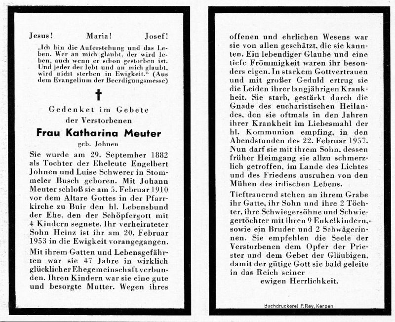Eltern: Engelbert Johnen u. Luise geb. Schwerer; ∞ 5.2.1910 Johann Meuter in Buir; 4 K.; verh. Sohn Heinz † 20.2.1953; langjährige Krankheit (Buir) |