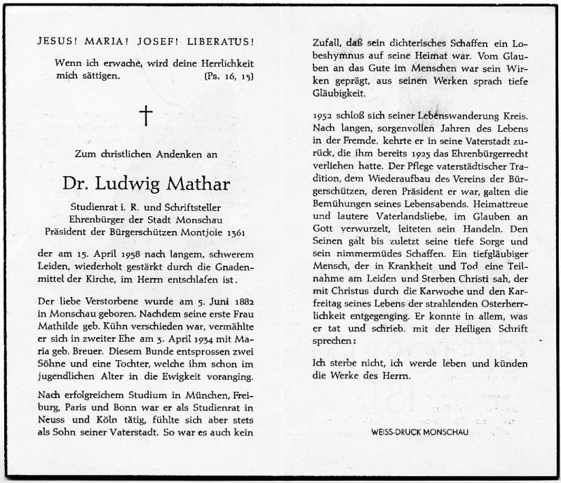 Studienrat i.R.u. Schriftsteller; 1925 Ehrenbürger d. Stadt Monschau; Präs. d. Bürgerschützen; ∞ Mathilde Kühn, †; ∞ 3.4.1934 Maria Breuer; 3 K., davon 1 †; StR in Neuss u. Köln; 1952 Rückkehr n. Monschau |