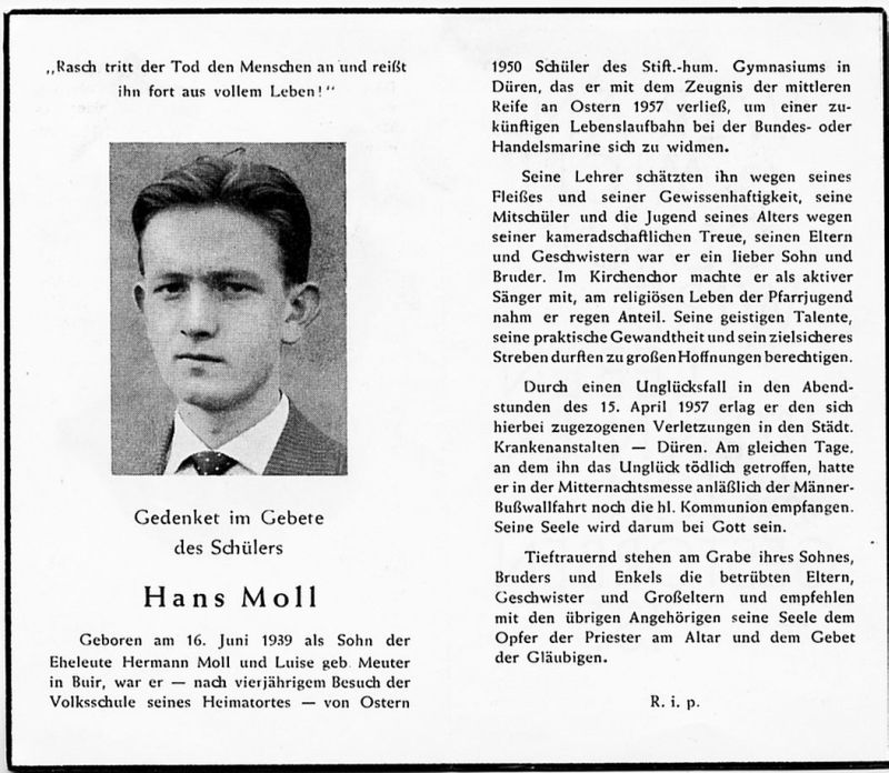Tödlich verunglückt; Eltern: Hermann Moll u. Luise geb. Meuter; Ostern 1947 Mittlere Reife Stift.-hum. Gymn. Düren; Mitgl. Kirchenchor |