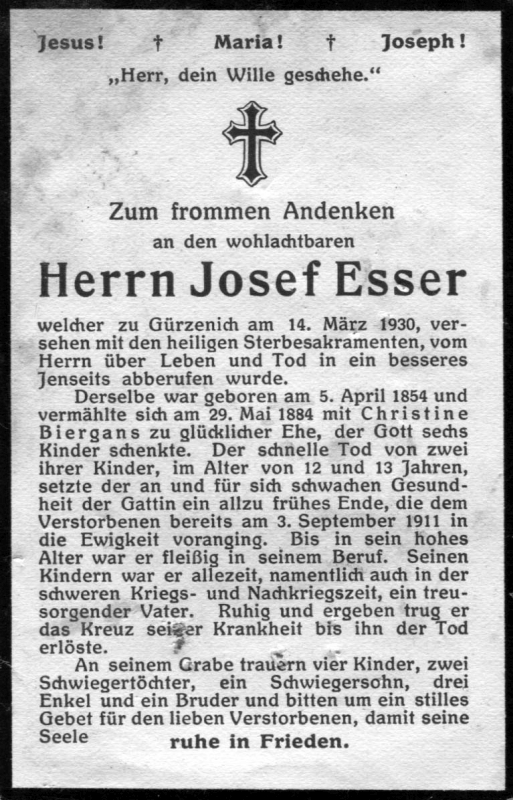 | ∞ 29.5.1884 Christine Biergans, † 3.9.1911; 6 K., davon 2 mit 12 u. 13 J. †; |