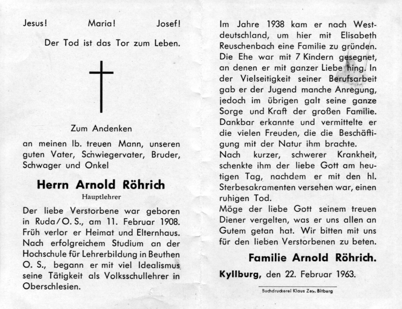 Volksschullehrer in Oberschlesien; verlor früh Elternhaus u. Heimat; kam 1938 nach westdeutschland; ∞ hier Elisabeth Reuschenbach; 7 K.; Wohnort Kyllburg; Druck in Bitburg |