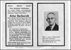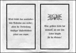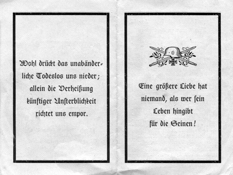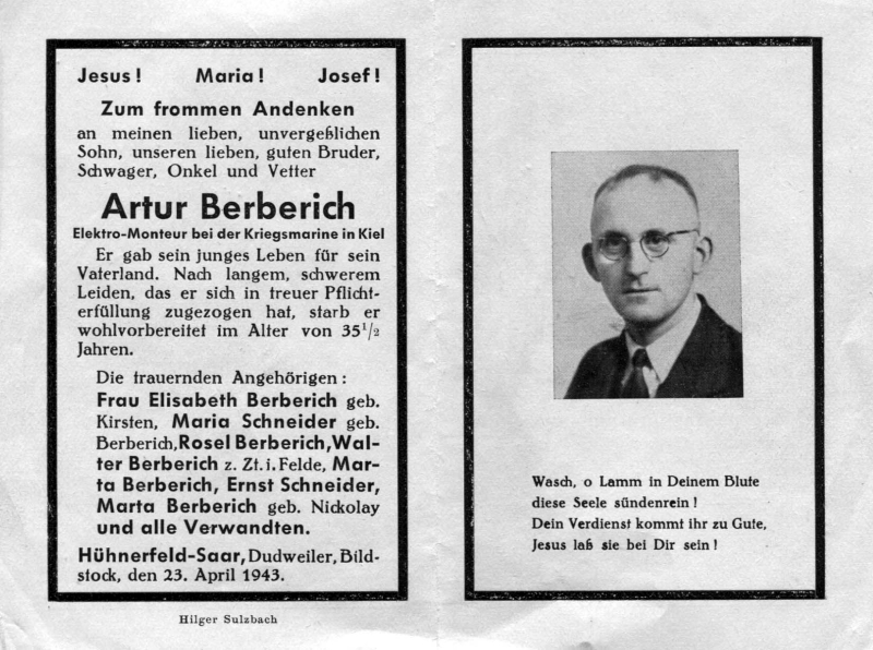 Gefallener 2. Weltkrieg; er starb nach langem Leiden, das er sich in treuer Pflichterfüllung für sein Vaterland zuzog; Elektro-Monteur bei der Kriegsmarine in Kiel; Wohnort: Hühnerfeld-Saar; ∞ Elisabeth Kirsten; Druck in Sulzbach |