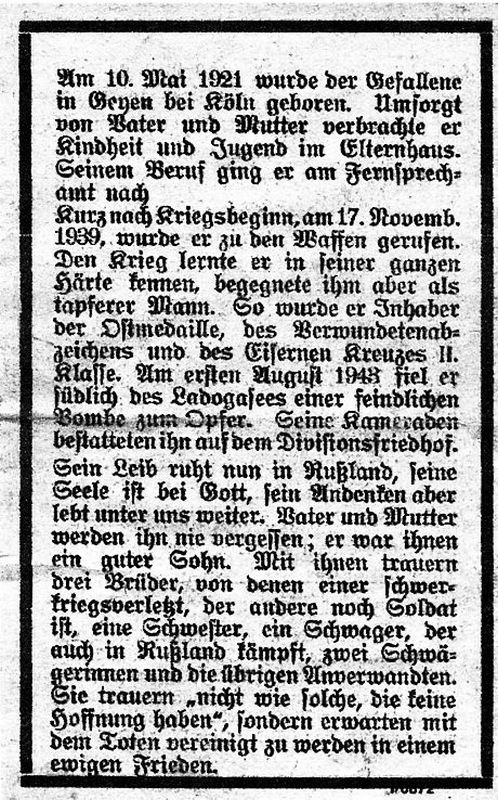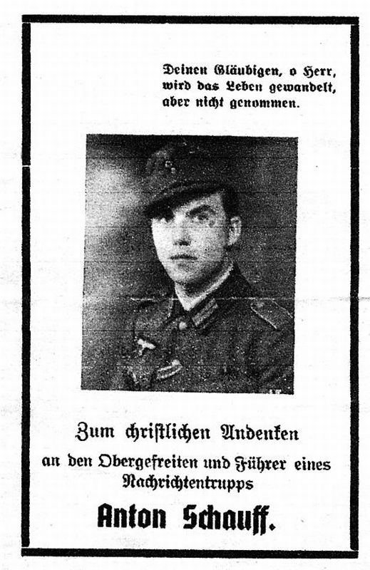 Gefallener 2. Weltkrieg; tätig beim Fernsprechamt; 17.11.1939 Einberufung zur Wehrmacht; 1 Bruder schwerkriegsverletzt, ein weiterer Bruder Soldat; |