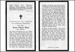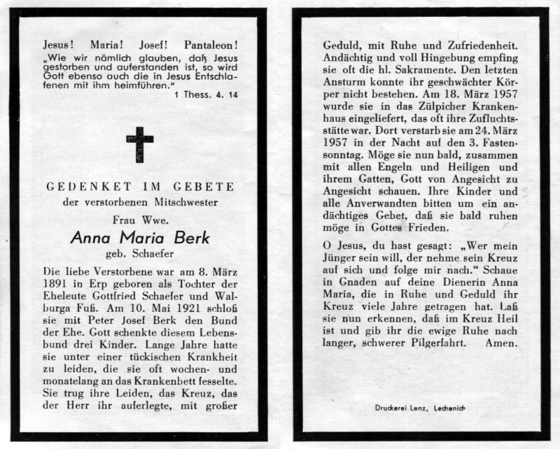 Eltern: Gottfried Schaefer u. Walburga geb. Fuß; ∞ 10.5.1921 Peter Josef Berk; 3 K.; mehrjähriges Leiden; Druck in Lechenich |
